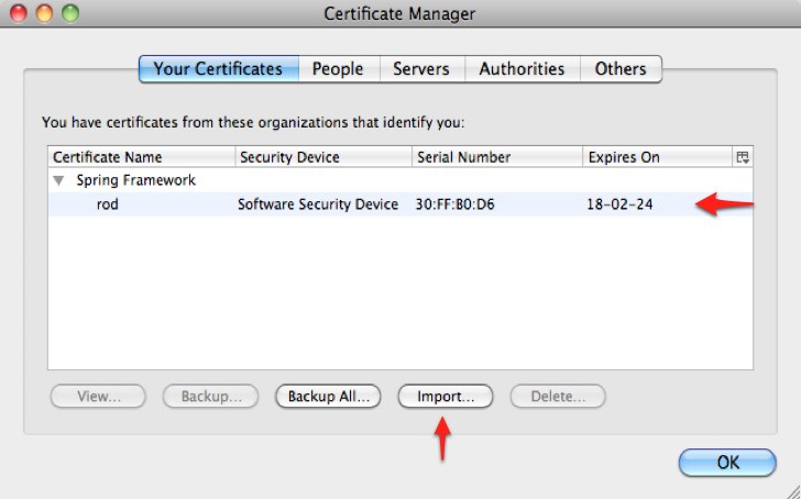 ca.pemis the certificate authority (CA) certificate issued by the "Spring Security Test CA" certificate authority. This file is used to sign the server and client certificates.server.jksis the Java keystore containing the server certificate and private key used by Tomcat and presented to the user during the setup of the SSL connection.rod.p12contains the client certificate / key combination used to perform client authentication via the web browser.
