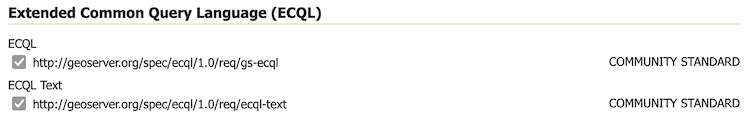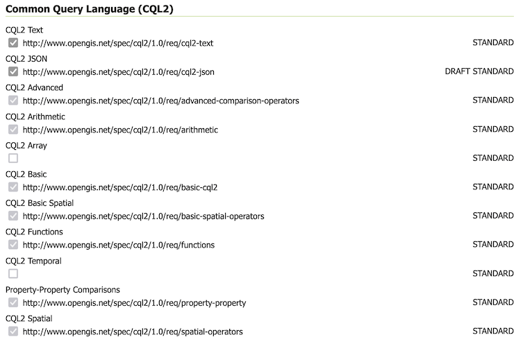 Both the Text and JSON formats for CQL2 are available and may be enabled or disabled.