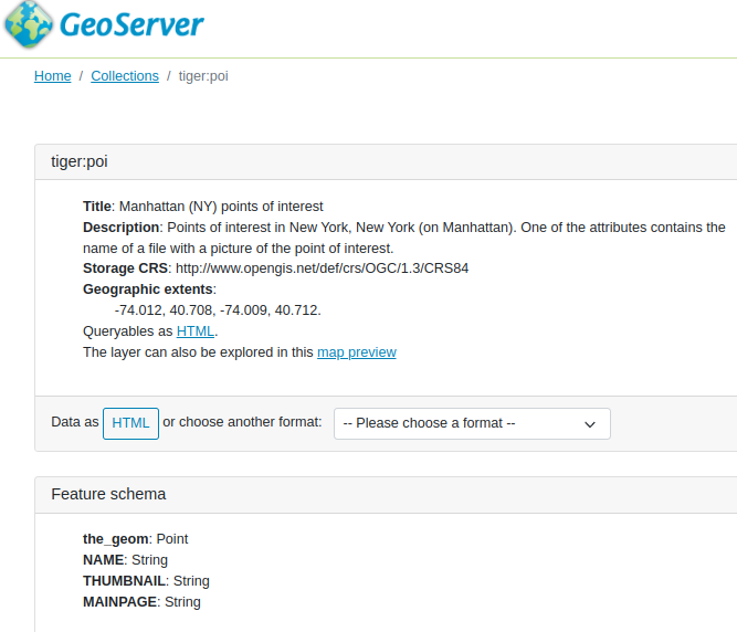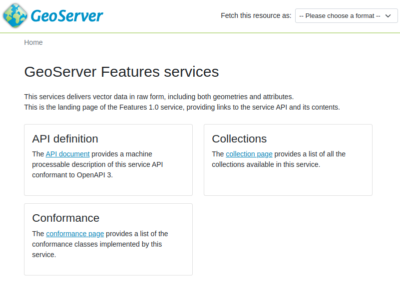 application/json: A collection ofjsondocuments, with reference between each document for programmatic access by web developers.json { "title": "GeoServer Features service", "description": "This service delivers vector data in raw form, including both geometries and attributes.", "links": [ { "href": "https://gs-main.geosolutionsgroup.com/geoserver/ogc/features/v1/?f=application%2Fjson", "rel": "self", "type": "application/json", "title": "This document" }, { "href": "https://gs-main.geosolutionsgroup.com/geoserver/ogc/features/v1/?f=application%2Fx-yaml", "rel": "alternate", "type": "application/x-yaml", "title": "This document as application/x-yaml" }, { "href": "https://gs-main.geosolutionsgroup.com/geoserver/ogc/features/v1/?f=text%2Fhtml", "rel": "alternate", "type": "text/html", "title": "This document as text/html" },