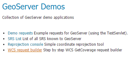 GeoServer includes a request builder for building and testing out WCS requests. Since WCS requests can be cumbersome to author, this tool can make working with WCS much easier.