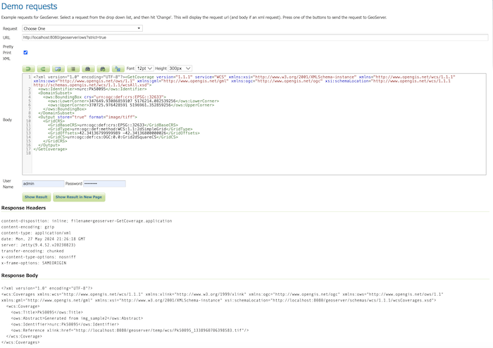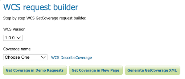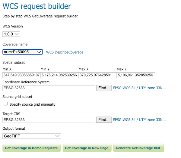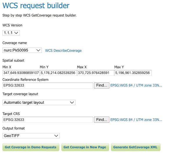 - Get Coverage in New Page---Executes a GetCoverage request using the parameters in the form. This will usually result in a file which can be displayed or downloaded.