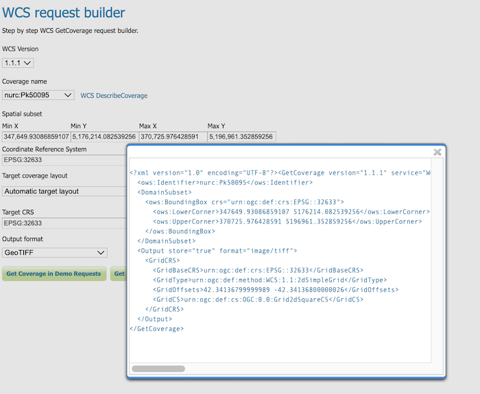 - Generate GetCoverage XML---Generates the GetCoverage XML request using the parameters in the form and then, instead of executing it, outputs the request itself to the screen.