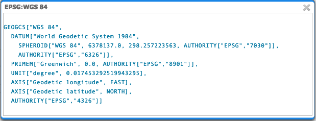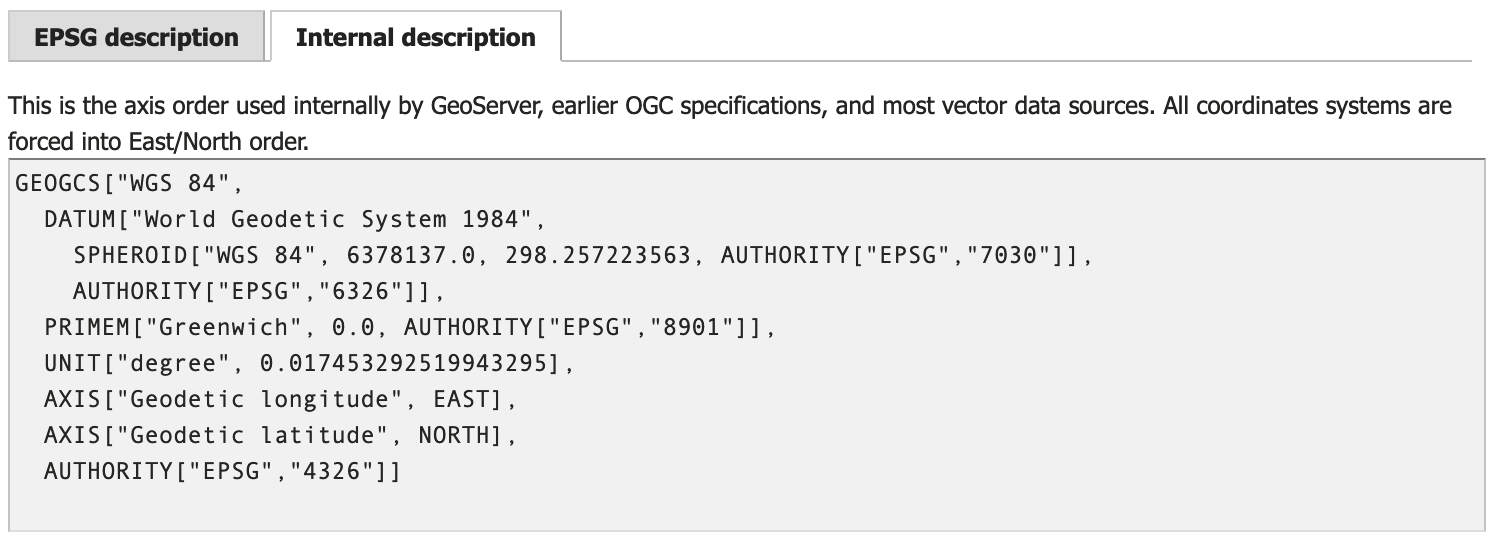 EPSG:4326as shown in the SRSList above, which also describes the data inx/yorder matching our data. This definition provides slightly more readable names along with additionalAUTHORITYinformation that may be helpful to client applications.