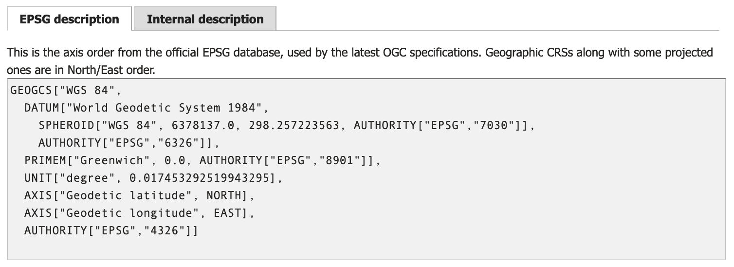 In the example above EPSG:4326 is defined with a north/east axis order, while the internal representation has east/north order.