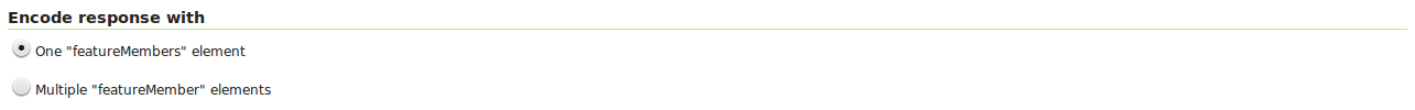 The Encode response with radio button group has two selection - One "featureMembers" element (the default) or Multiple "featureMember" elements. This switches the WFS 1.1.0 encoding accordingly. Use of multiple featureMember elements may be required for Application Schema referencing.