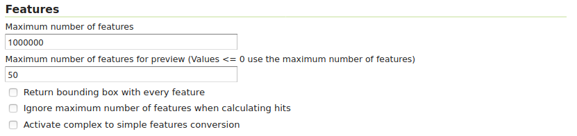 Maximum number of features --- Maximum number of features that a WFS GetFeature operation should generate, regardless of the actual number of query hits. A WFS request can potentially contain a large dataset that is impractical to download to a client, and/or too large for a client's renderer. Maximum feature limits are also available for feature types. The default number is 1000000.