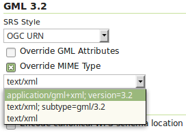 Option Override MIME Type allows the selection of the MIME type that should be used for the responses encoded in GML 3.2.