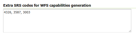 A list of values to be declared in all feature types can be provided in the WFS administration panel, as a comma separated list of EPSG codes: