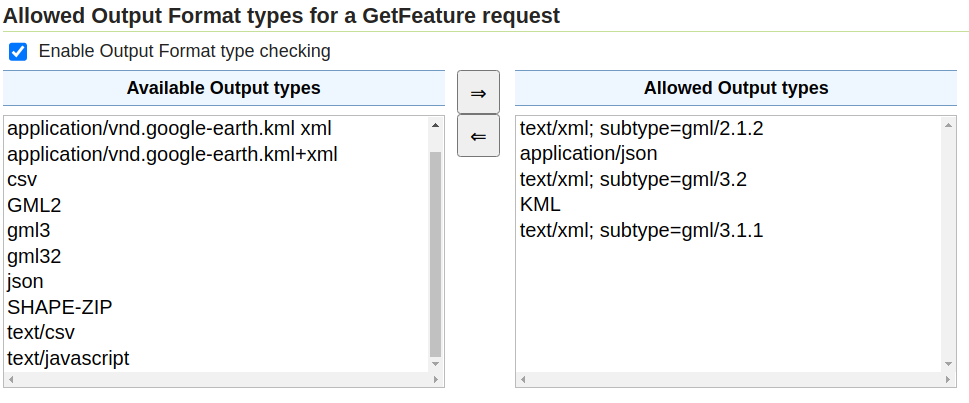 Checking the Enable Output Format type checking checkbox will enable restrictions on the available output formats for GetFeature requests. It will also limit what Output Format types will be displayed as available in GetCapabilities responses. GetFeature requests with Output types not included in the Allowed Output types panel will result in an Invalid Parameter ServiceException response.