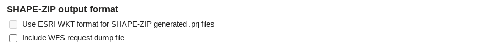 Selecting the Use ESRI WKT format for SHAPE-ZIP generated .prj files checkbox modifies how projections are encoded in the Shapefile zip output format. If this checkbox is not selected, OGC WKT format will be used. If this checkbox is selected, ESRI WKT format will be used.