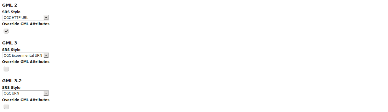 WFS 2.0.0 request return GML 3.2 as the default format, WFS 1.1.0 requests return GML 3 as the default format, and WFS 1.0.0 requests return GML 2 as the default format. For each of the GML formats supported by GeoServer, a different SRS format can be selected.