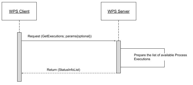 The client makes a simple "GetExecutions" request to the WPS Server, in order to get back an XML document containing the list of current Execution Statuses.