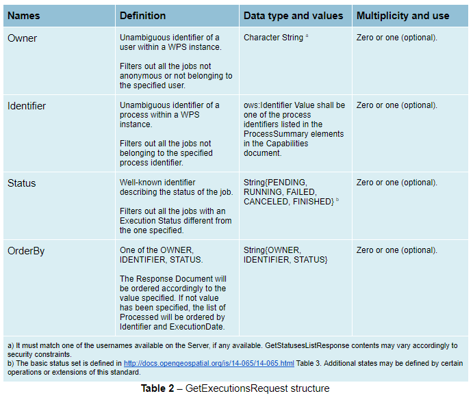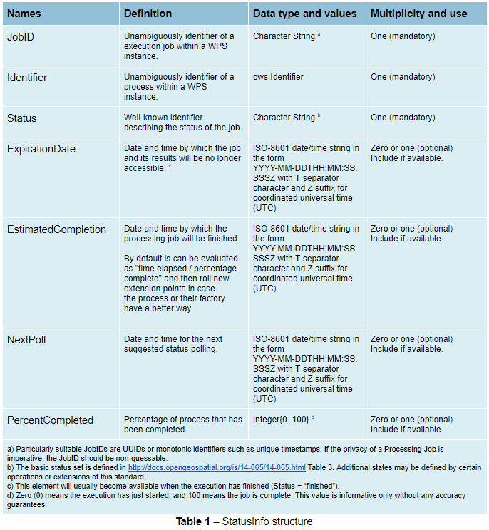 The StatusInfo document is used to provide identification and status information about jobs on a WPS server. The operation adds additional fields to the StatusInfo Document reporting also the WPS Process Identifier and other information on estimated execution and expiration time.