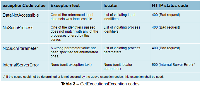 When a WPS server encounters an error while performing an GetExecutionsResponse, it shall return an exception report as specified in clause 8 of [OGC 06-121r9]. If appropriate, the server shall use additional exception codes as defined in this section.