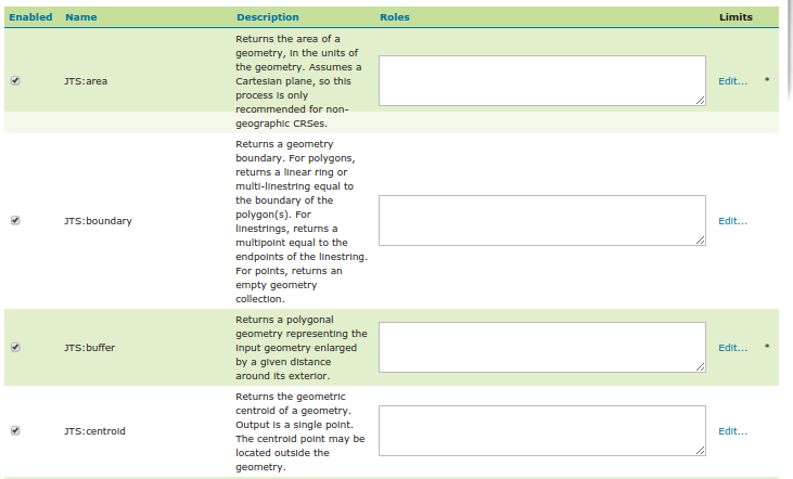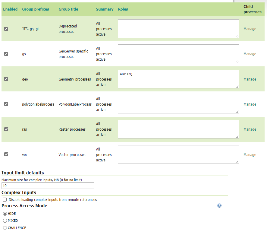 - HIDE (default): The processes not available to the current user will be hidden from the user (not listed in the capabilities documents). Direct access will result in GeoServer claiming the process does not exist.