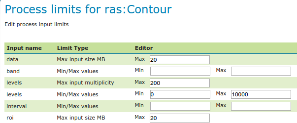 The process limits editor shows all inputs for which a limit can be provided. An empty field means that limits are disabled for that input.