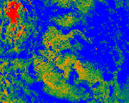 The next example shows selecting a single band of an RGB image as a grayscale channel, and re-colorizing it via a ColorMap: