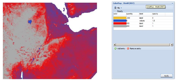 A color map is defined by a sequence of <ColorMapEntry> elements. Each <ColorMapEntry> element specifies a color and a quantity attribute. The quantity refers to the value of a raster pixel. The color value is denoted in standard hexadecimal RGB format (#RRGGBB). <ColorMapEntry> elements can also have opacity and label attributes. The opacity attribute overrides the global <Opacity> value. The label attribute is used to provide text for legends. A color map can contain up to 255 <ColorMapEntry> elements.