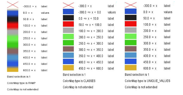 The <ColorMap> type attribute specifies the kind of ColorMap to use. There are three different types of ColorMaps that can be specified: ramp, intervals and values.