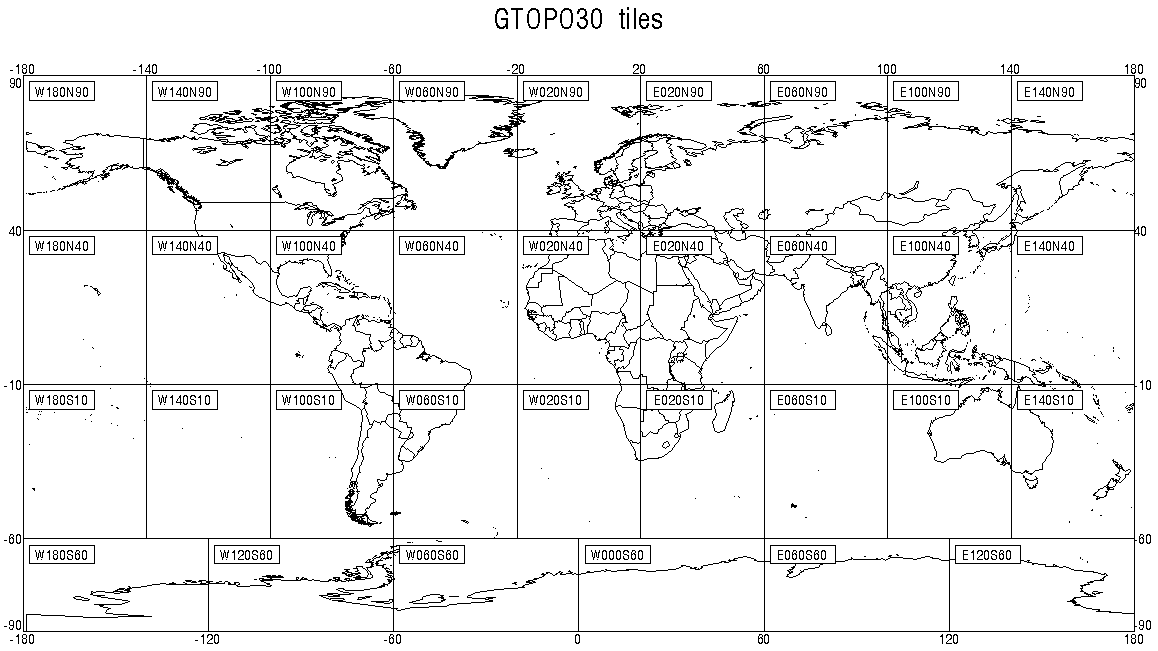 A digital elevation model records height information for visualisation and analysis. We are using a dataset derived from the USGS GTOPO30 dataset.