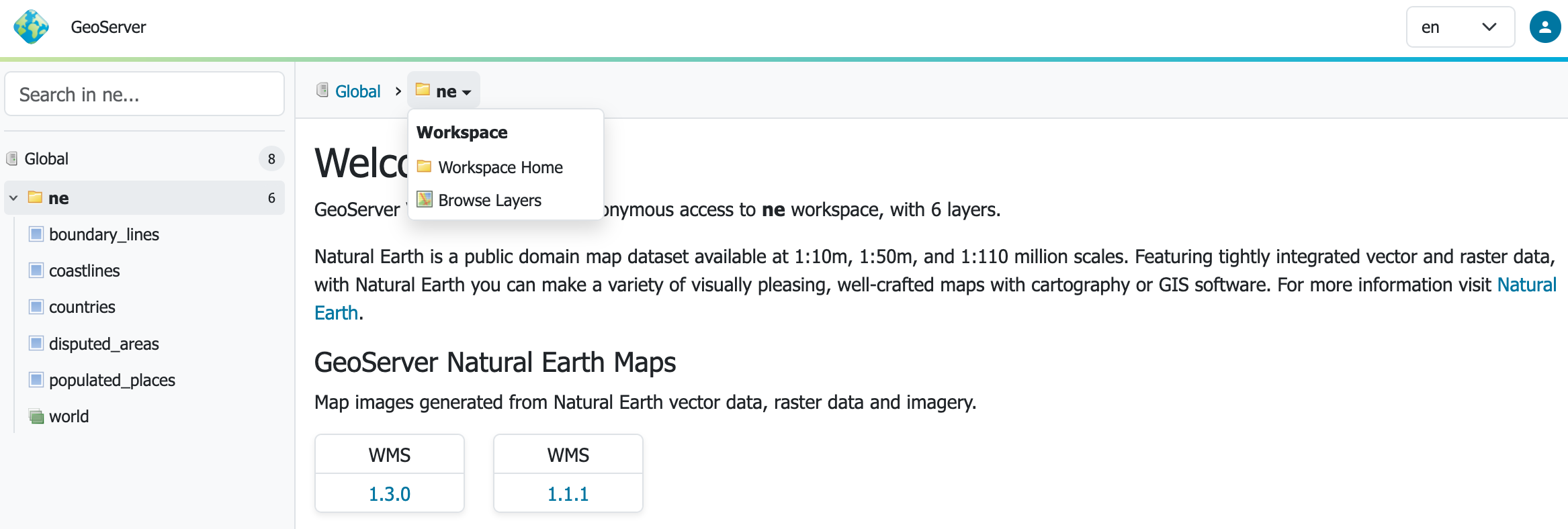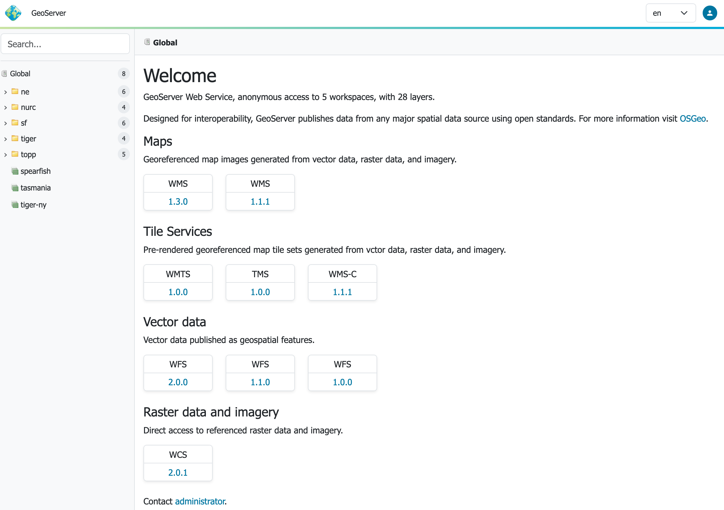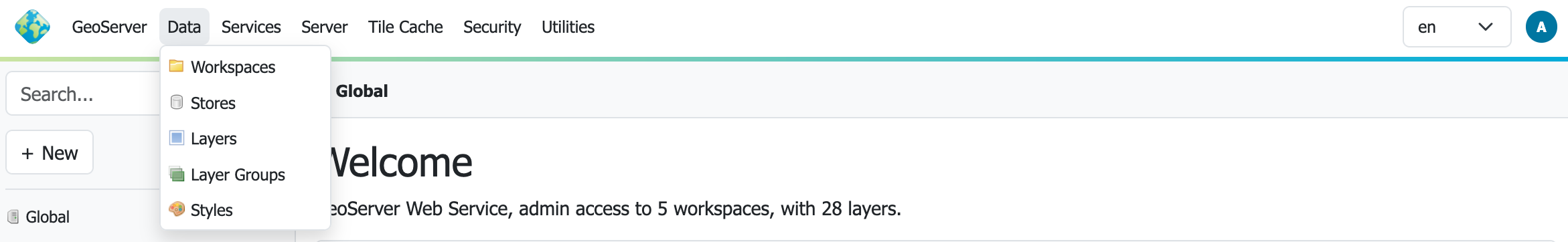 Menu: The menu bar at the top of the page provides login on the right hand side, and access to the familiar GeoServer top-level menus. Many of these pages now adjust their content to reflect the current context.
