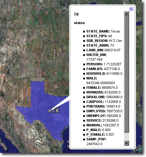When working with KML, each feature is linked to a description, accessible when the feature is clicked on. By default, GeoServer creates a list of all the attributes and values for the particular feature.